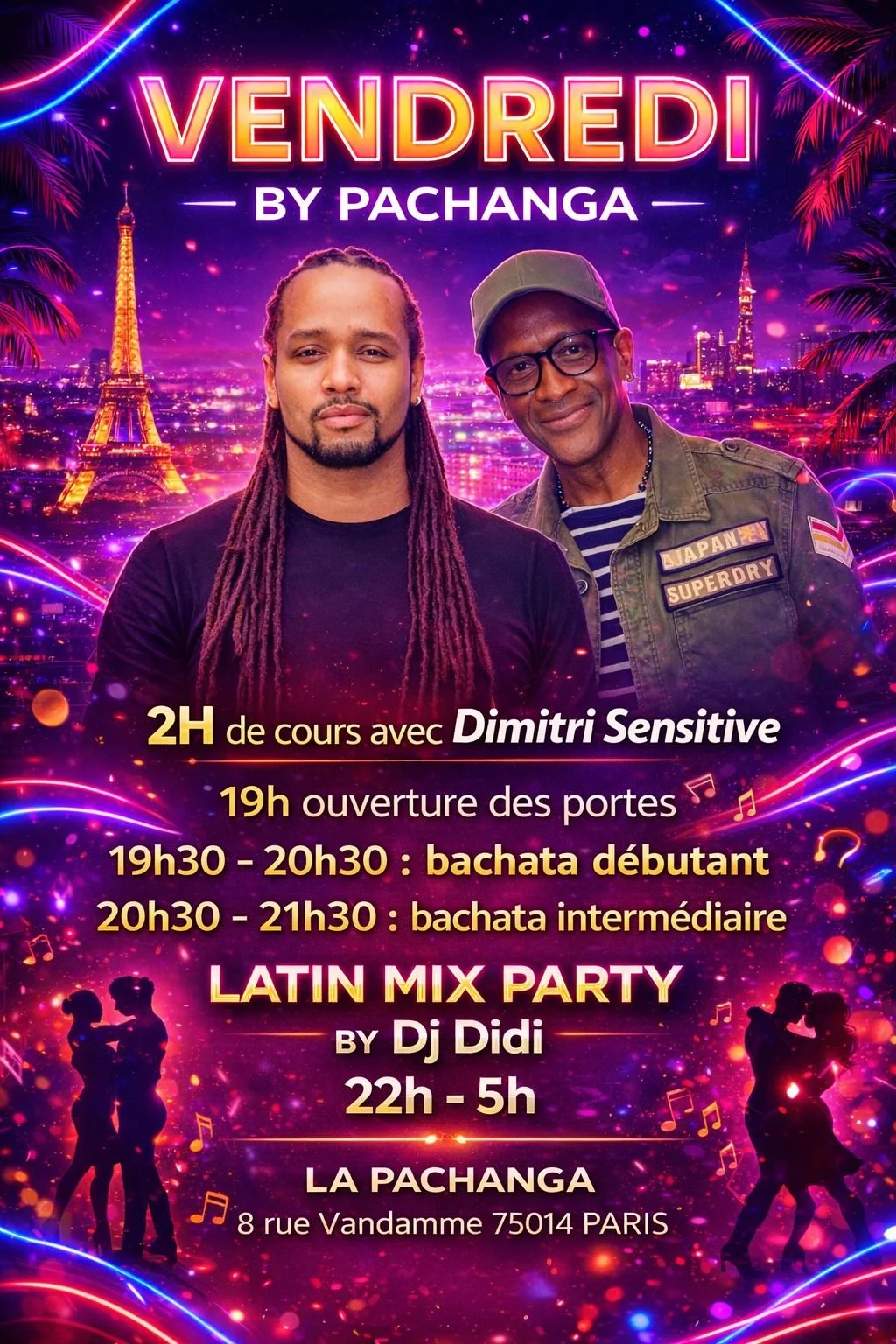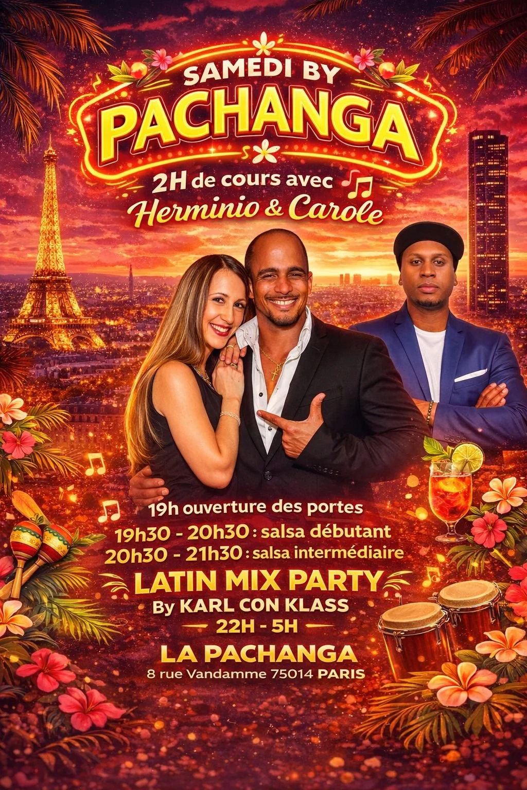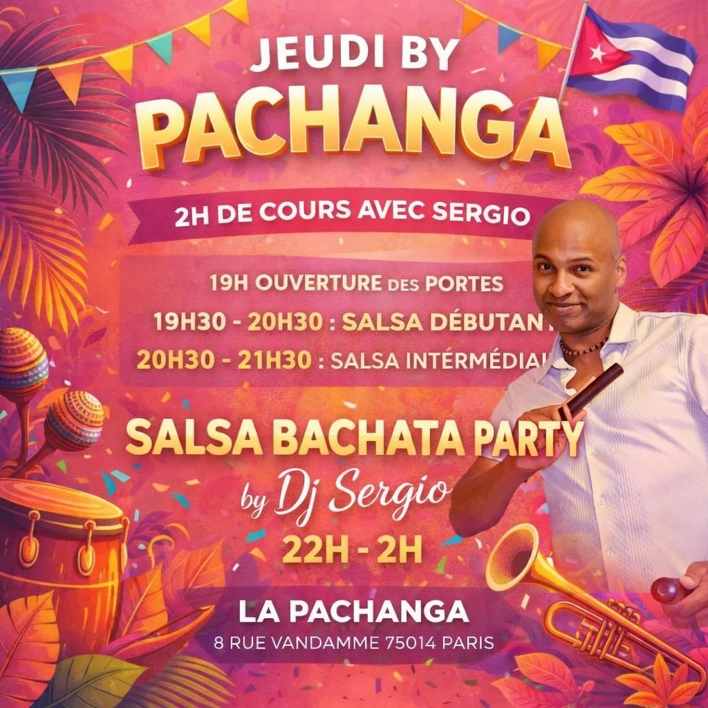 La Pachanga, le lieu de tous les amoureux de la salsa à Paris. Nous sommes ouvert du Mercredi au Samedi. Le mercredi et Jeudi de 19h à 2h , le vendredi, samedi & veille de jours fériés de 19h à 5h. Arrivée conseillée à 19h pour démarrage des cours à 19h30.