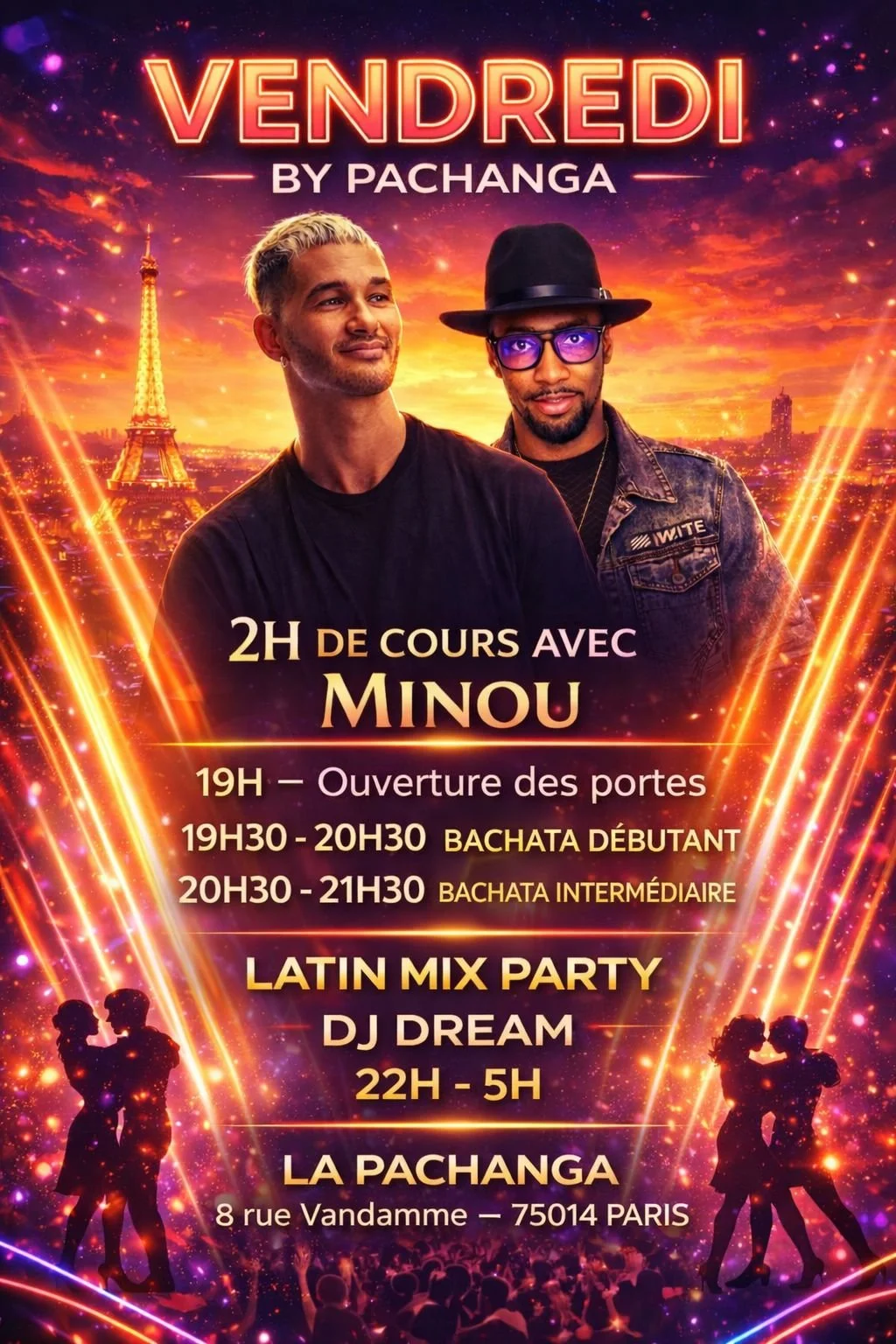 La Pachanga, le lieu de tous les amoureux de la salsa à Paris. Nous sommes ouvert du Mercredi au Samedi. Le mercredi et Jeudi de 19h à 2h , le vendredi, samedi & veille de jours fériés de 19h à 5h. Arrivée conseillée à 19h pour démarrage des cours à 19h30.